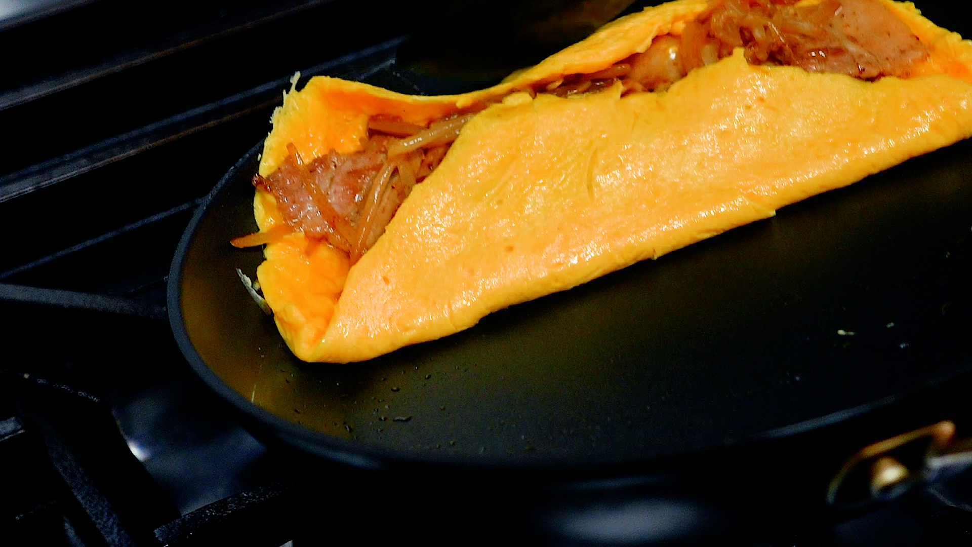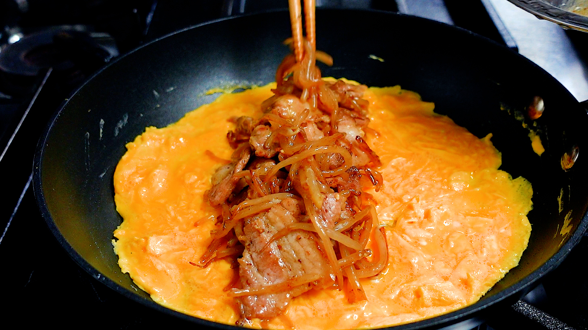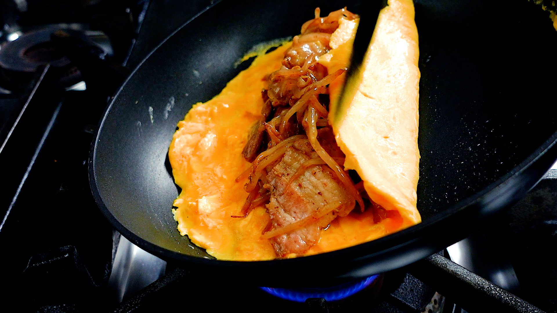 炒めた豚肉ともやしを真ん中にのせる。弱火にかけ、ヘラで卵の両側を折りたたむ。