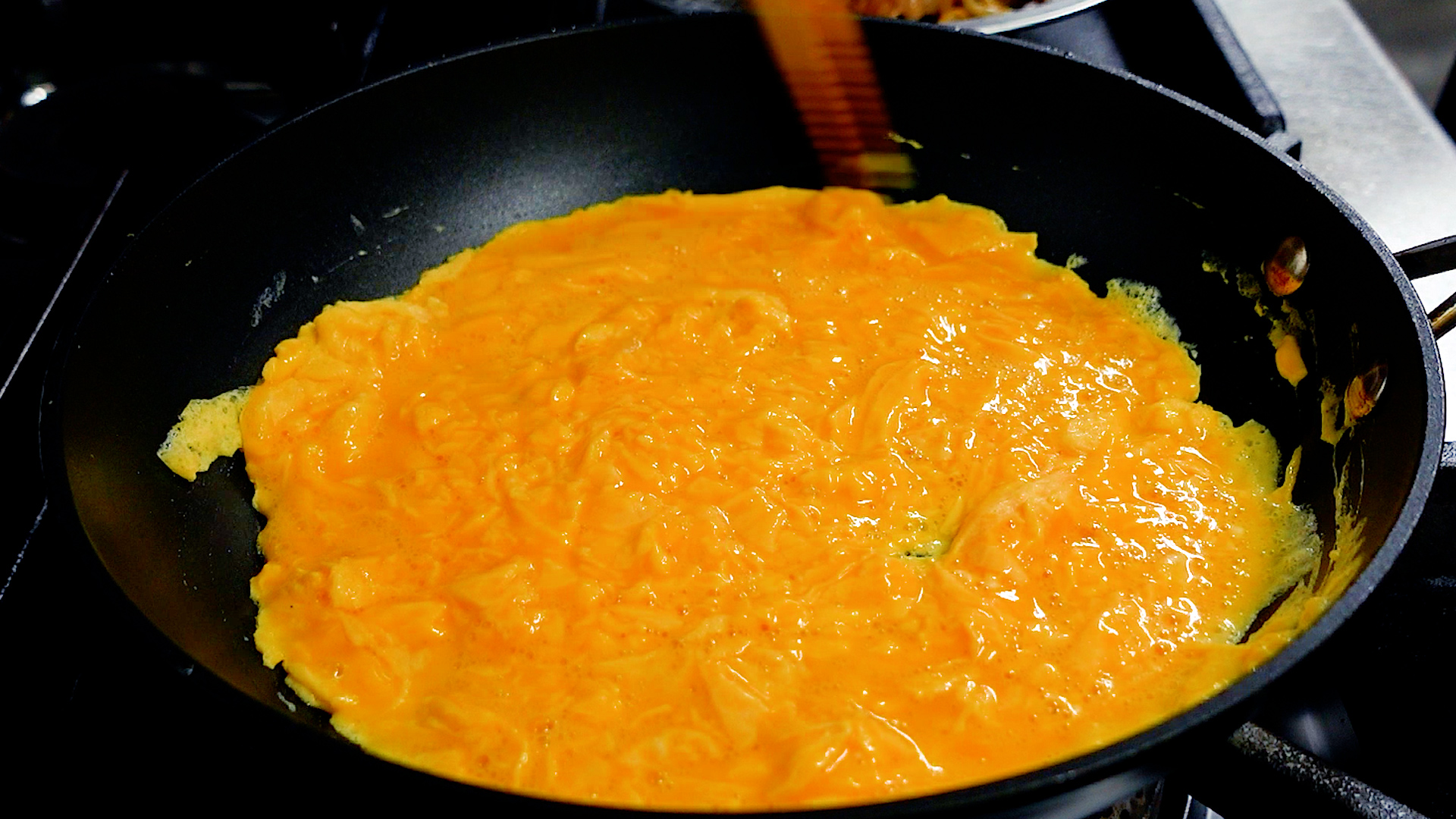フライパンをペーパーでふき、サラダ油 大さじ1/2を入れ中火にかける。油を全体になじませ溶き卵を加え、フライパンをゆすり菜箸で混ぜながら半熟状にし火を止める。