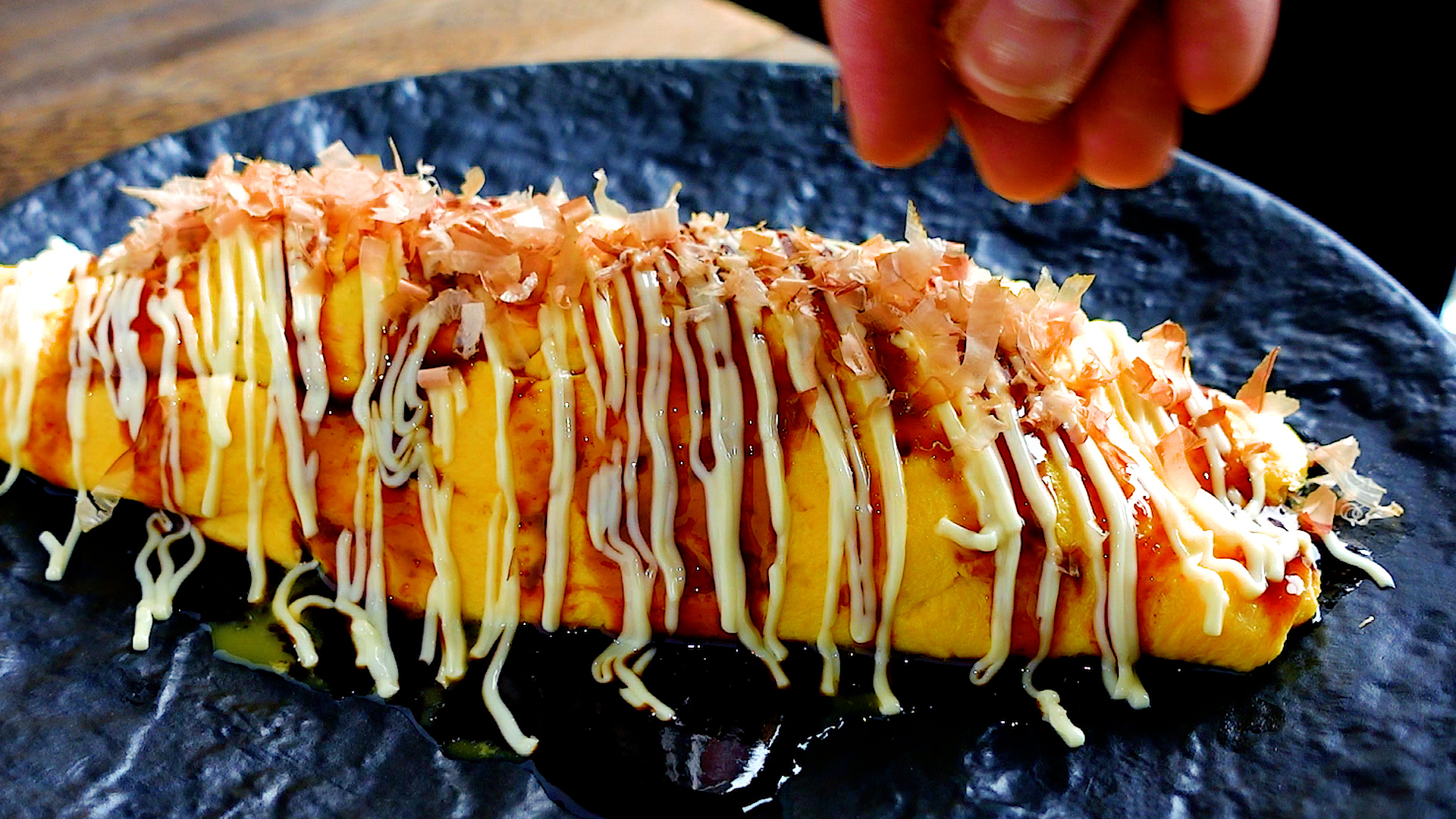フライパンを逆手に持ち皿に返し形を整え、中濃ソース、マヨネーズ、かつお節をかける。